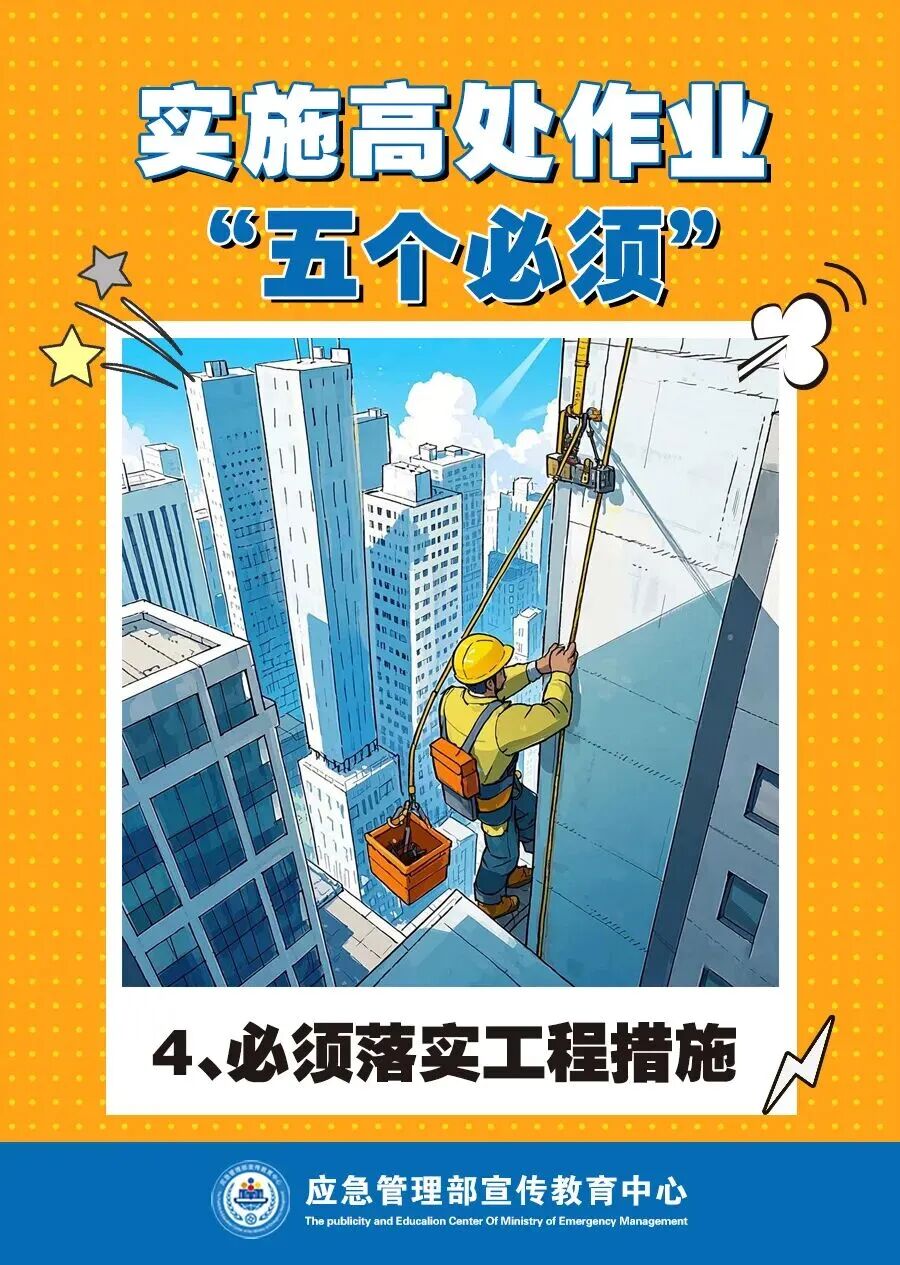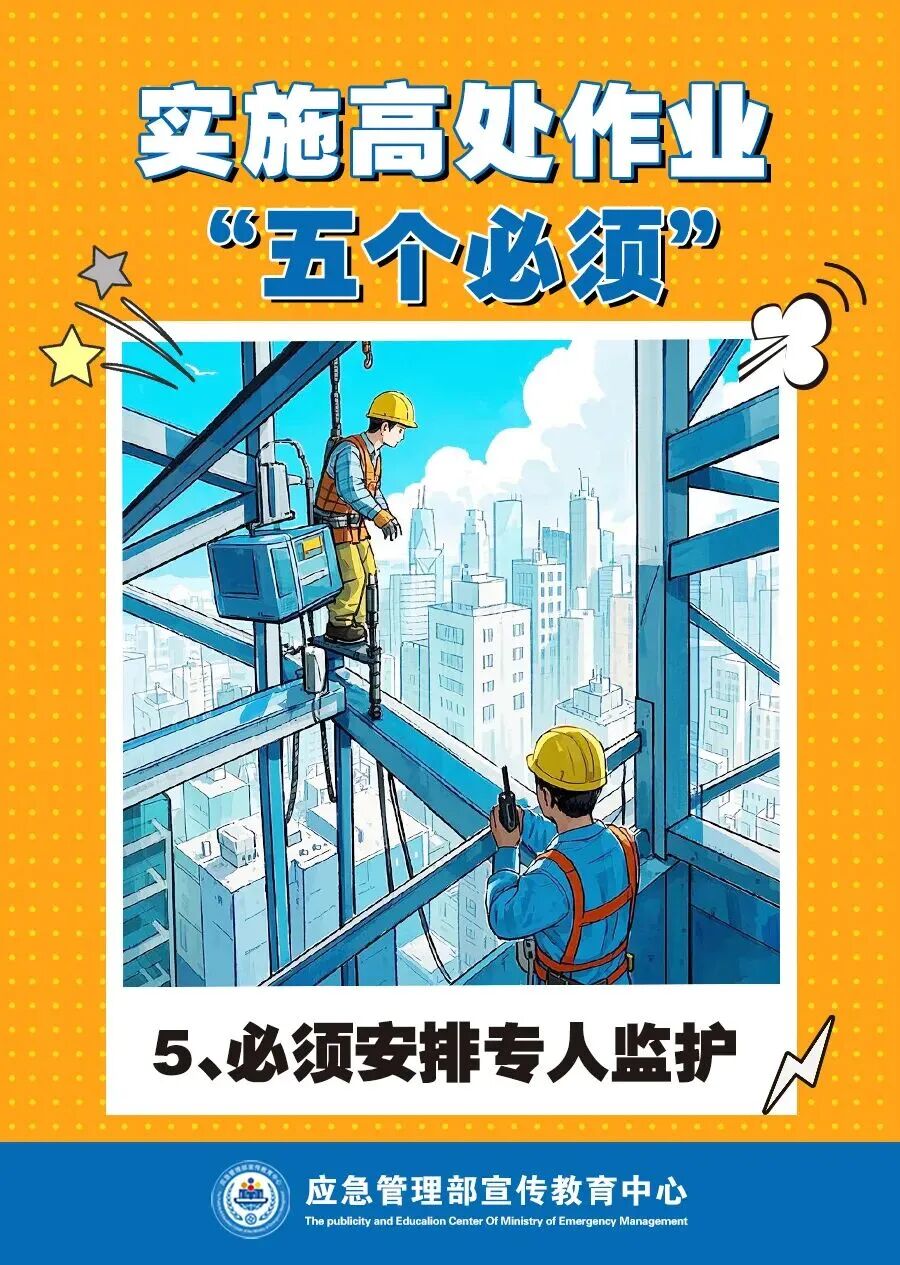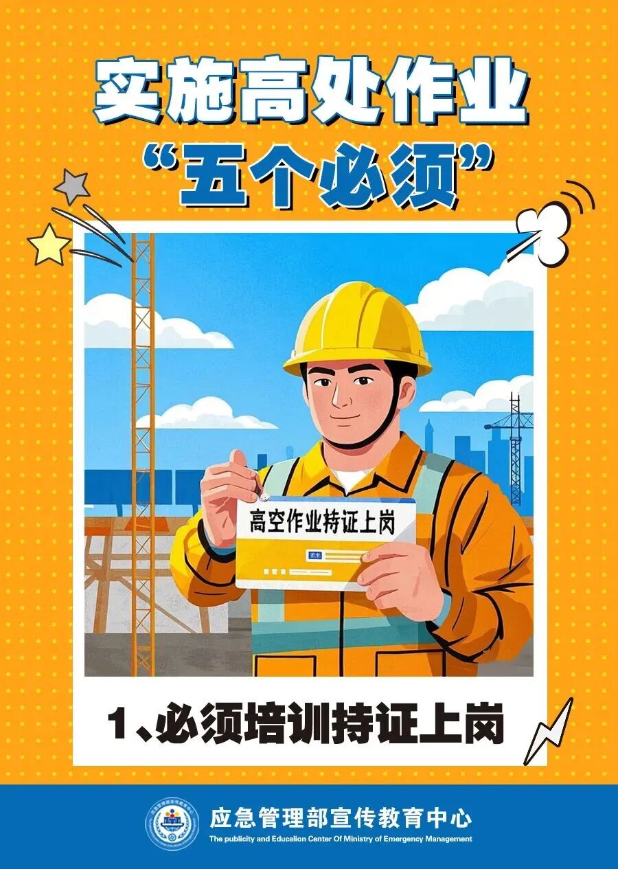 在企业生产过程中 经常会遇到高处作业情况 在高处作业时 作业人员活动范围小 四周临空、垂直交叉作业 作业环境复杂 稍有疏忽就有可能发生事故 根据 《特种作业人员安全技术培训考核管理规定》 高处作业 指专门或经常 在坠落高度基准面2米及以上 有可能坠落的高处 进行的作业 具体包括以下两种 1、登高架设作业:指在高处从事脚手架、跨越架架设或拆除的作业。 2、高处安装、维护、拆除作业指在高处从事安装、维护、拆除的作业。适用于利用专用设备进行建筑物内外装饰、清洁、装修,电力、电信等线路架设,高处管道架设,小型空调高处安装、维修,各种设备设施与户外广告设施的安装、检修、维护以及在高处从事建筑物、设备设施拆除作业。 高处作业 属于特种作业范畴 从业人员除了做好安全防范措施 必须经专门的安全技术培训 并考核合格 取得特种作业操作证后 方可上岗作业 施工人员要按照相关规范作业 正确佩戴防坠落护具 做好防护措施 避免意外事故的发生 高空作业 “五个必须”要做到 来源:中国安全生产网,应急管理部